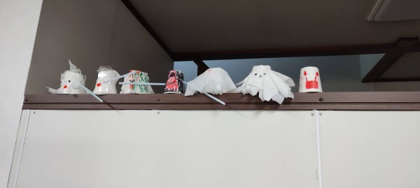 テーブルサッカーハロウィン版をしました。1日目は、紙コップでお化けを制作。