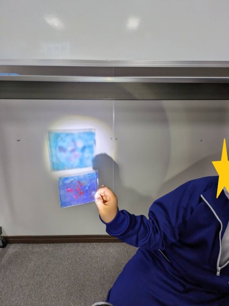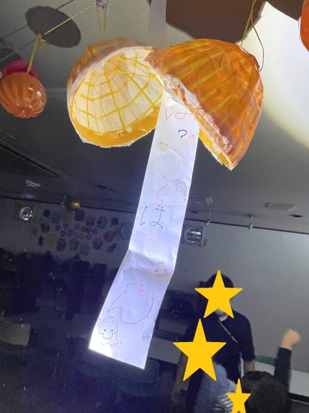 シャッターが閉まったダークバージョンのからふるを、昨日制作した透明シートに書いた絵をライトにかざし壁に写したり、お化けやカボチャの影絵ライトや、色が変わる明かりのスピーカーなど一通り暗闇を満喫したあと、お待ちかねの一大イベント、ジャック・オ・ランタンのくす玉割をしました。