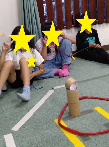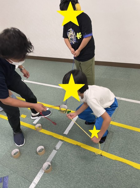 🌟輪ゴムに4本のひもをつけ、それを引く・戻すで伸び縮みさせガムテープ芯をつかみ先にある輪の中に積んでいくゲームをしました。3人一組になり協力性と集中力が必要となる難易度の高いゲームです😣💦💦