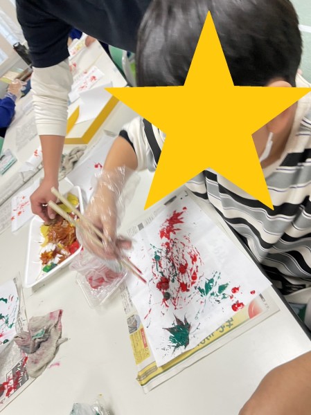 汚れないように気を付けながら、ビニール手袋や、お箸を使って自由に描いていきます。