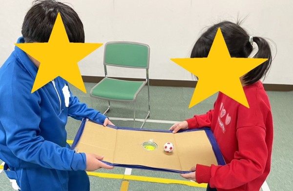 中央に穴の開いたボードの四隅を二人でもって、穴に落とさずに一周移動する活動を行いました。二人での協力ゲームです。