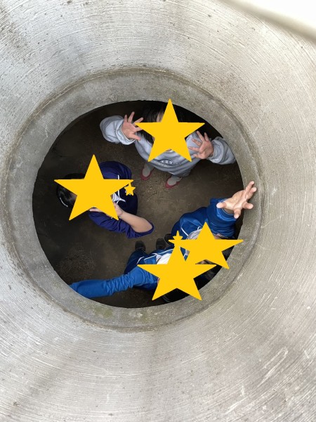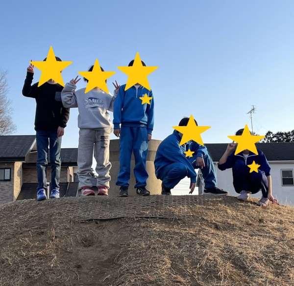 元気いっぱい走って鬼ごっこやかくれんぼを楽しんだ後、築山のトンネルと頂上で記念撮影。