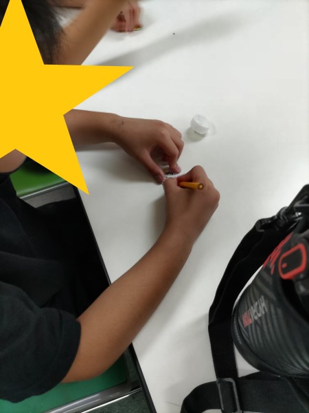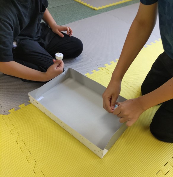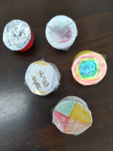 ペットボトルのキャップと割りばしの欠片を組み合わせて作るコマは、市販のおもちゃとはひと味違う個性あふれるアイテム。お子様たちはそれぞれ自由に装飾し、カスタマイズを加えながら、自分だけのオリジナルコマを完成させました。