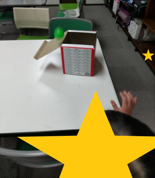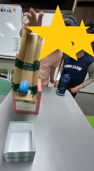 カラーボールをワンバウンドさせて、紙コップや箱の中に入れるというシンプルながらも集中力と工夫が試される遊びです。