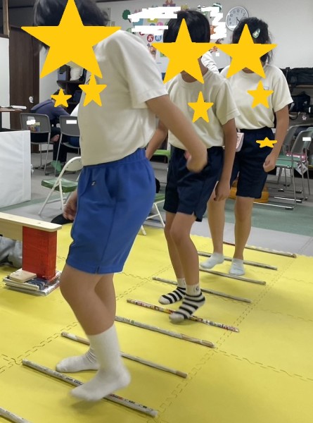 下をくぐる場面では、大型の職員が挑戦しましたが上手くいかず、それを見たお子様が「僕がやってみせるよ」と見本になってくれました。自分の身体の隅々まで意識する動きです。