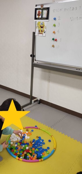 「算数は苦手💦」と話していたお子様も、「これ、楽しい。家でもしたい」と話してくれました。合っても間違えてもOK。楽しい宝探し感覚で楽しんでくれました。答えのペットボトルキャップが宝物です😊
