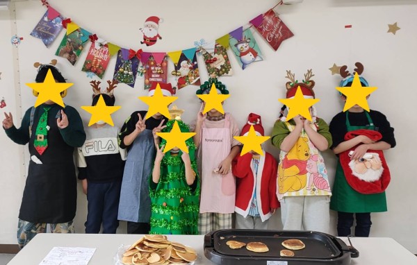 午前中はパンケーキ作り。混ぜて焼いて。学校によって冬休の始まりが違うので、午後から参加するお友達の分もたくさん焼いてくれました。