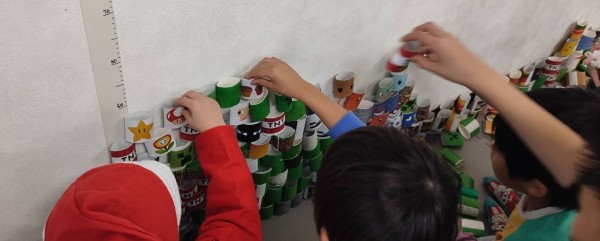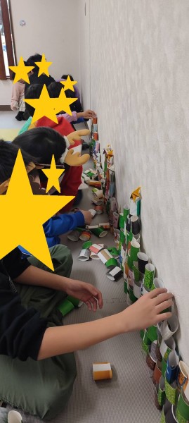 出来るだけたくさんの材料を用意するために、トイレットペーパーの芯を半分に切って、 皆の好きなキャラクターの模様を貼ってXmas用に豪華にしました。