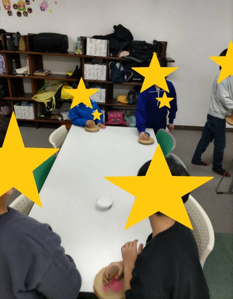 段ボールとはいえ、机いっぱいに広がるコートと手作りのスティックが相まって、まるで本物のエアホッケーのような迫力。2人ずつペアになって対戦すると、「点が決まったー!」「やられたー!」といった声があちこちから聞こえ、室内は大盛り上がりでした。遊びながら自然と目と手の協調が育まれ、相手との距離感ややり取りを楽しむ姿も見られ、コミュニケーションの広がりを感じる時間となりました。