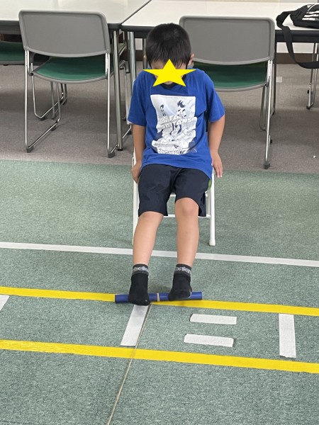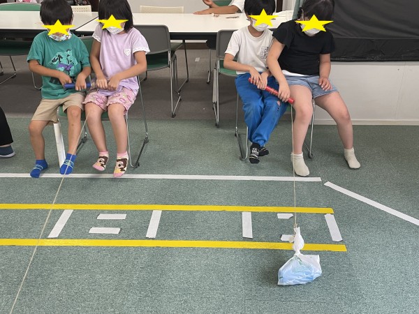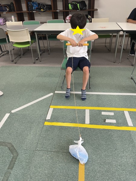 巻いて巻いて握力を強くするぞー‼とラップの芯を利用して巻き巻き棒を作って遊びました。ひもの先に重りをつけて、よーいドン!で巻いて行きます。「早さじゃなく最後まで頑張るゲームだよ」と声掛けし、見た目よりハードな運動に一生懸命取り組むお子様たち。左右差も意識して、「真ん中に巻いていくと上手く行くよ」とアドバイスすると、自らほどいて頑張る姿もありました。自分の手元に重りが来ると「魚釣りみたい」と釣られた魚のように重りを持ち上げ成果に満足そうでした!!