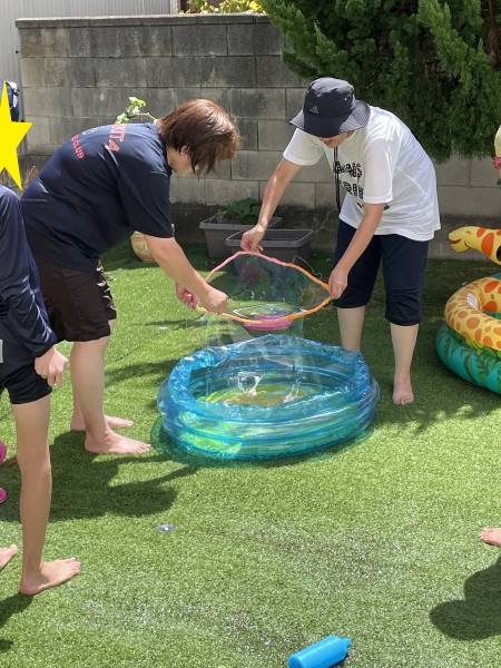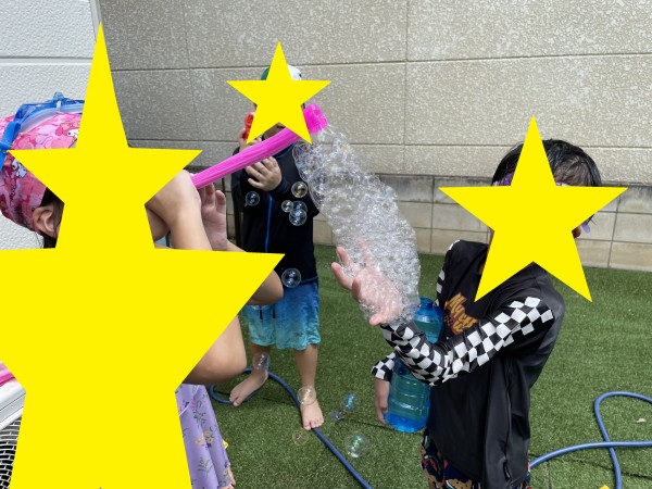 本日のメインイベント!!先生たちによる実験です😊さぁ!!お子様たちが中に入るほどの大きな大きなシャボン玉が