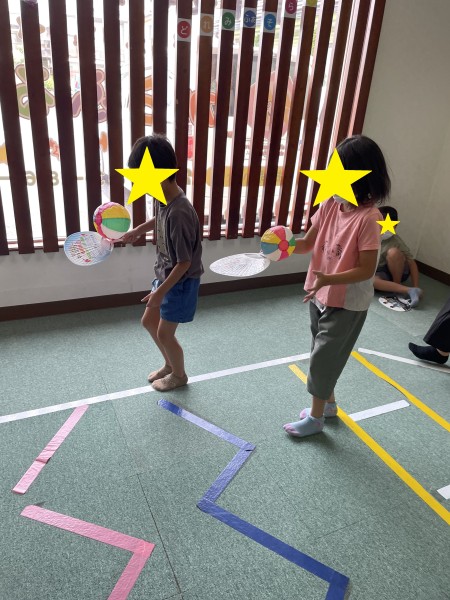 そーっと そーっと 紙風船運びをしました。どうやったら 落とさずに うまく運べるか? 勝負に真剣なお子様たちは、同意のうえ、風に邪魔されないよう エアコンの風も緩めて、汗をかきながら そろりそろりと 慎重に足を進めます。