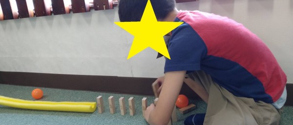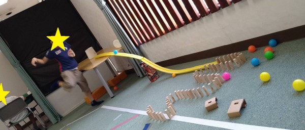 ジェンガのコマをを使いドミノ並べをしていたRくん工作などのものつくりが大好きであれよあれよのうちに大作に!!完成させていました!!