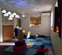 ゴールデンウイークの連休に挟まれた利用日は、お子様の心や体のリズムも乱れがちになります。そんな日の活動は「スヌーズレン」。窓を塞いでお部屋を暗くして、プロジェクションランプやファイバーライト、風船...
