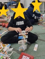 制作を行いました。切った段ボールに色紙のパーツ等を張っていき、お子様達も知っているゲームのクリーパーというキャラクターを作りました。併せて、安全指導として正しい文具の使い方についても話をしました...