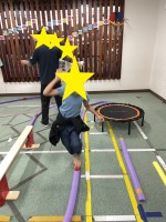 空きビンや水を入れたペットボトルを寝かせて床に置き、それを輪っかのついた紐で立たせるというゲームをしました。 腕全体から指先までの細やかな操作や調整力等を意識できるような活動です。柔らかい腕・手...